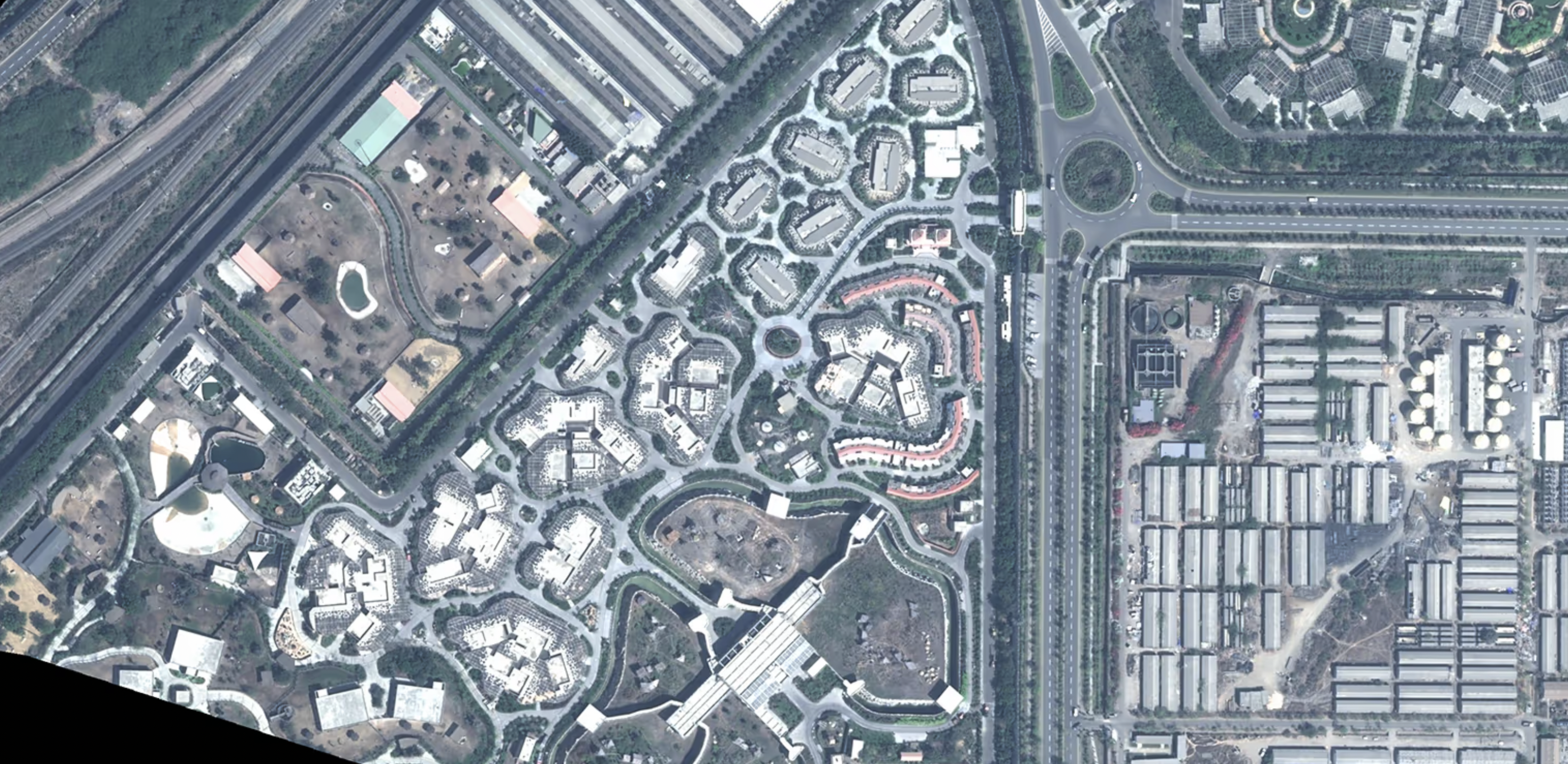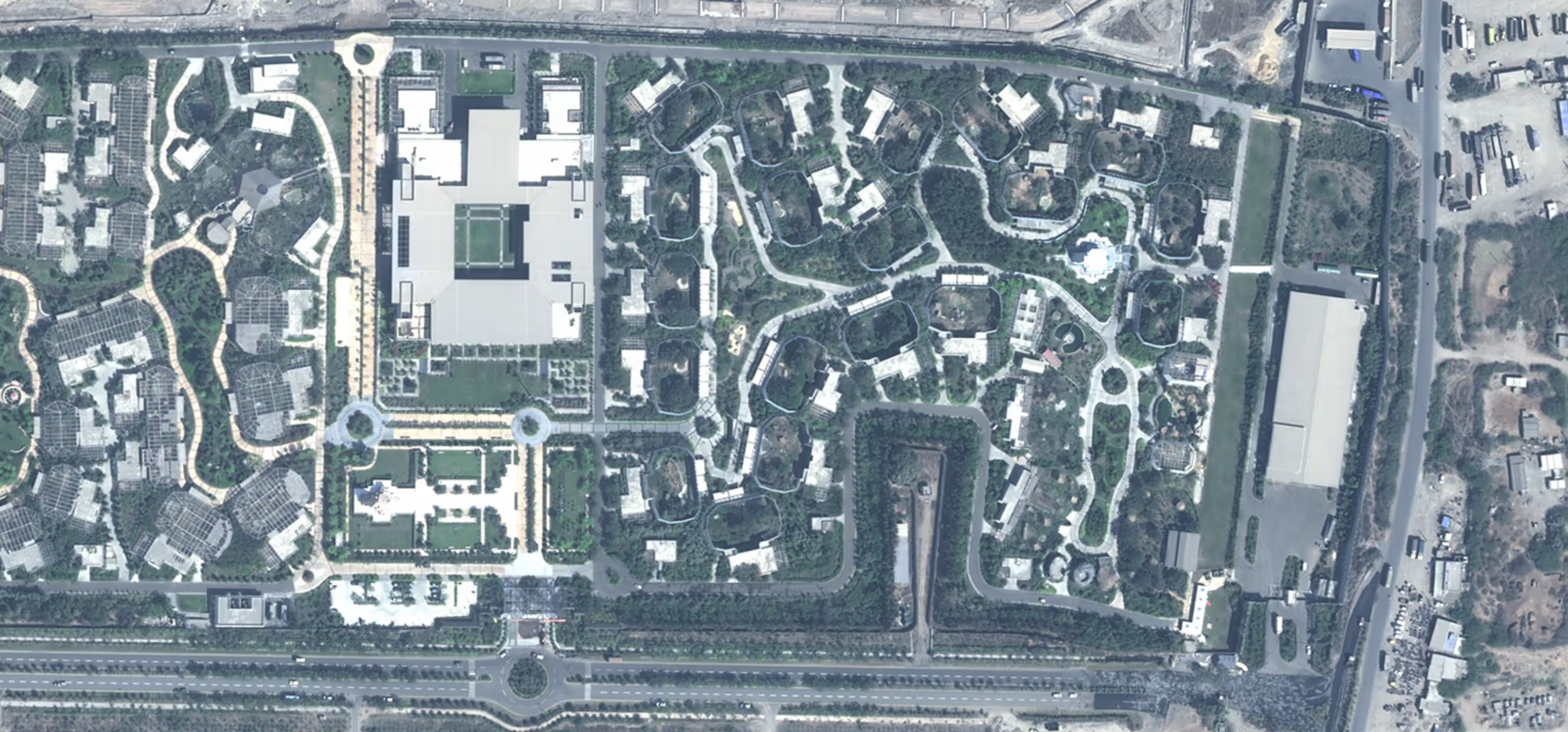 Erst von oben wird das Ausmaß der Anlage sichtbar. Gehege reihen sich an Gehege. Die Gebäudegruppen wirken von oben surreal, fast wie eine Ferienanlage.
