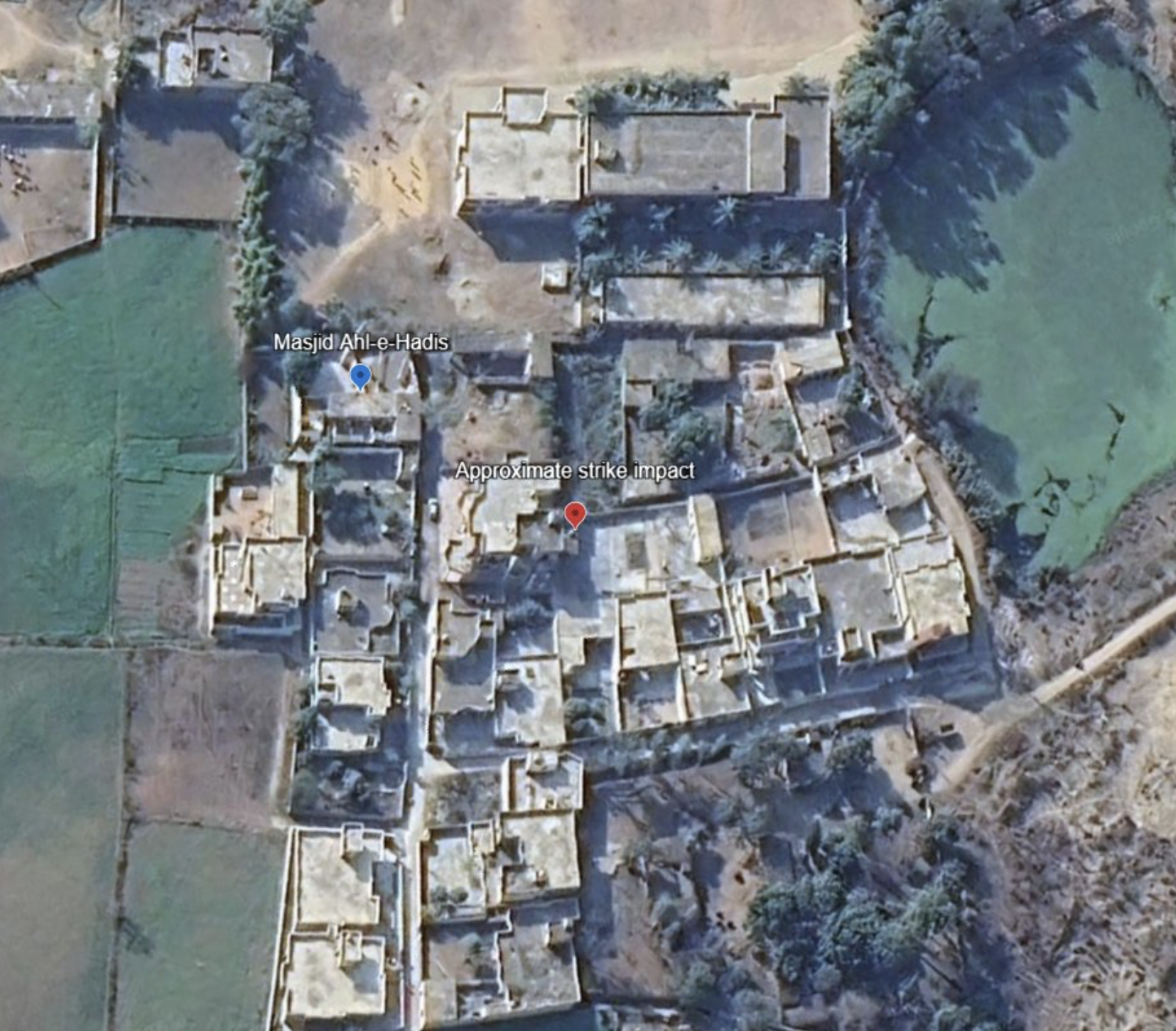 Quadcopter-dropped munition appear to miss the target building and strike a courtyard around 50m away.