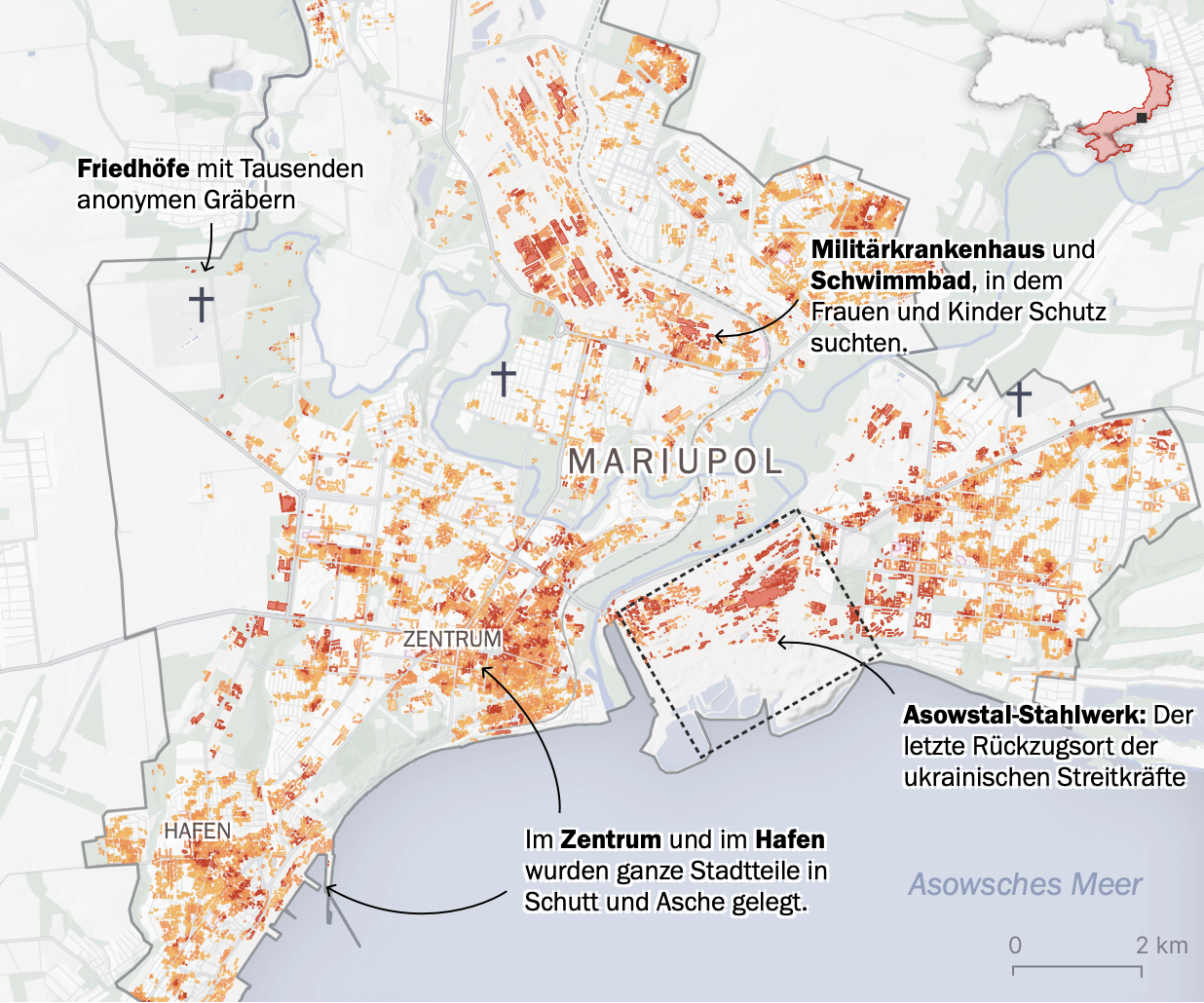 Um Falscherkennungen zu vermeiden, wurde das Modell so kalibriert, dass nur größere Veränderungen als Schaden eingeordnet werden. Sonst riskiert man etwa, auch Veränderungen wie fehlende parkende Autos als Schaden einzuordnen. Es handelt sich um eine eher konservative Schätzung. Im Fall von Mariupol etwa geht die UN von deutlich höheren Zahlen aus: 90 Prozent der mehrstöckigen und 60 Prozent der kleineren Wohnhäuser Mariupols seien zerstört.