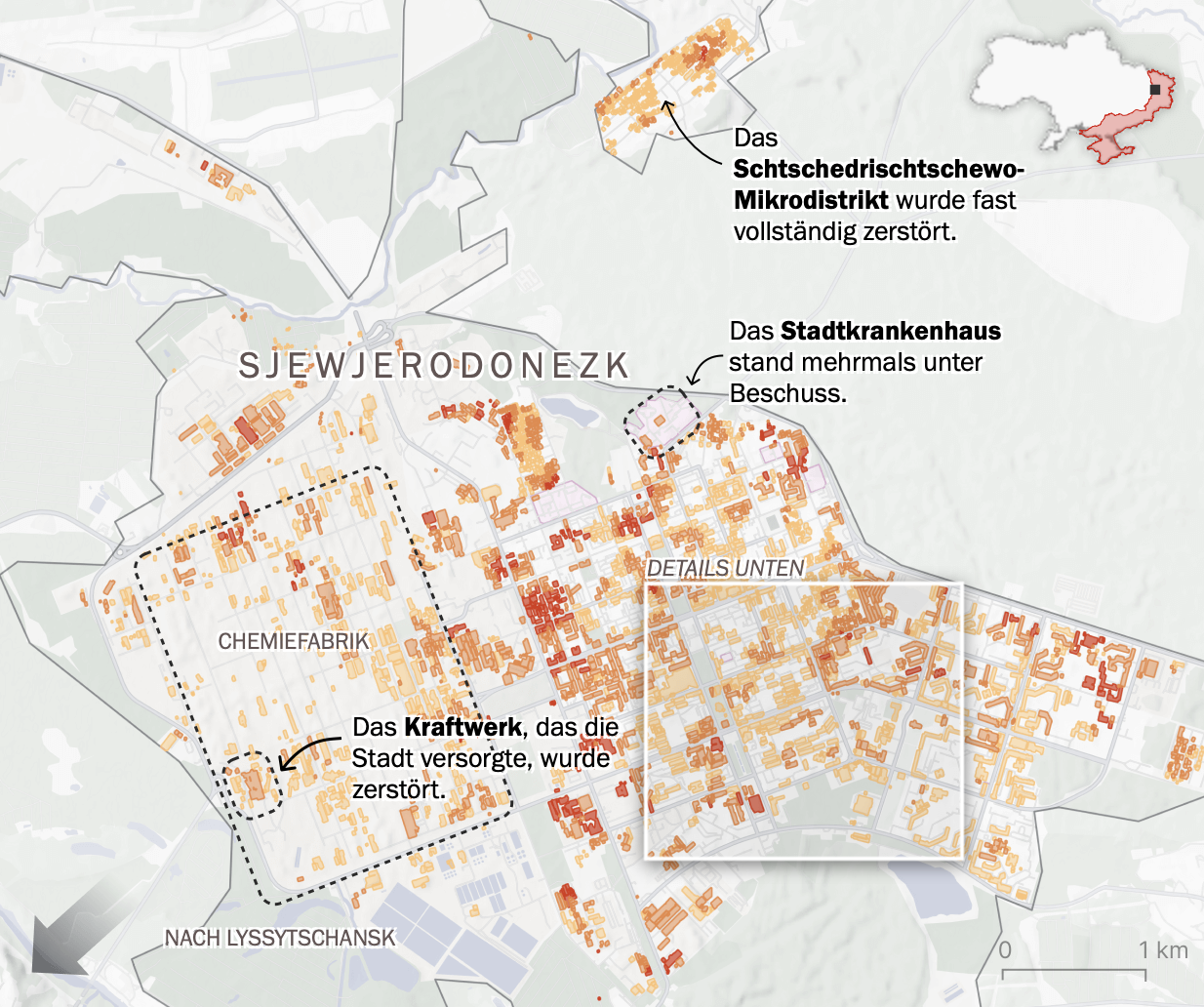 Die russische Armee nahm die Stadt am 25. Juni 2022 ein. Davor waren Sjewjerodonezk und die Nachbarstadt Lyssytschansk die einzigen größeren Teile der Oblast Luhansk, die noch unter ukrainischer Kontrolle standen. Vor dem Krieg wohnten hier etwa 100.000 Menschen, jetzt sind es nach Angaben der Anwohner nur noch sehr wenige, Schätzungen gehen von 10.000 aus. Wo sollen sie auch leben? 36 Prozent der Gebäude sind der experimentellen Analyse zufolge zerstört.
