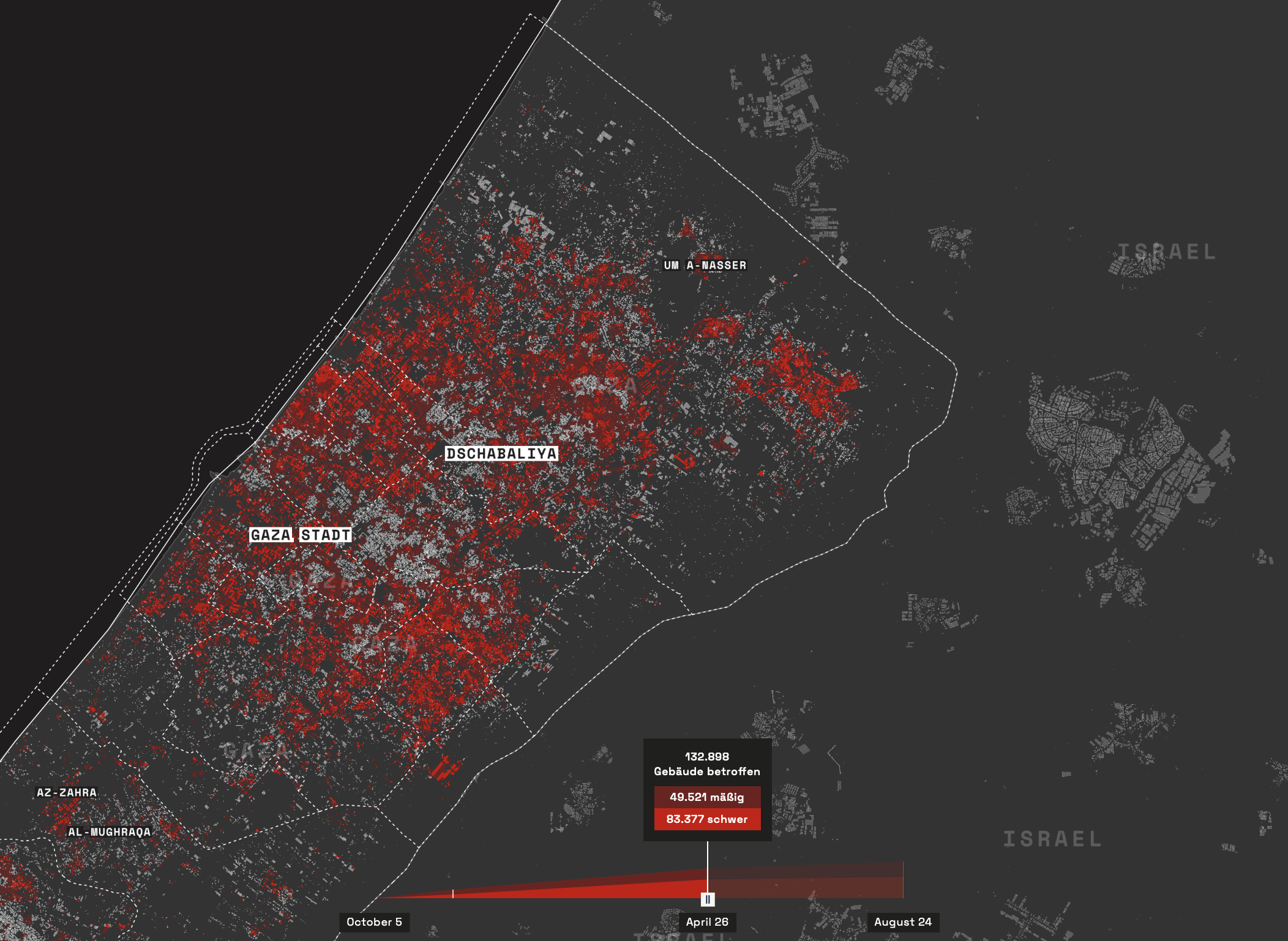 Dieser Krieg, in dem die Hamas Zivilisten und zivile Gebäude als Schutzschilde einsetzte, hat große Teile des Küstenstreifens zerstört. Klick auf die Grafik, um dir die Zerstörung im Detail anzusehen.